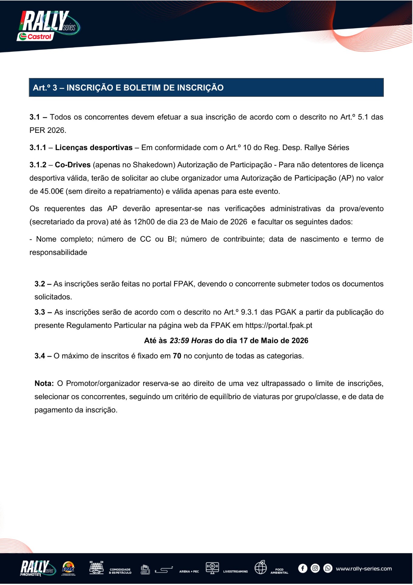 – O máximo de inscritos é fixado em 70 no conjunto de todas as categorias.